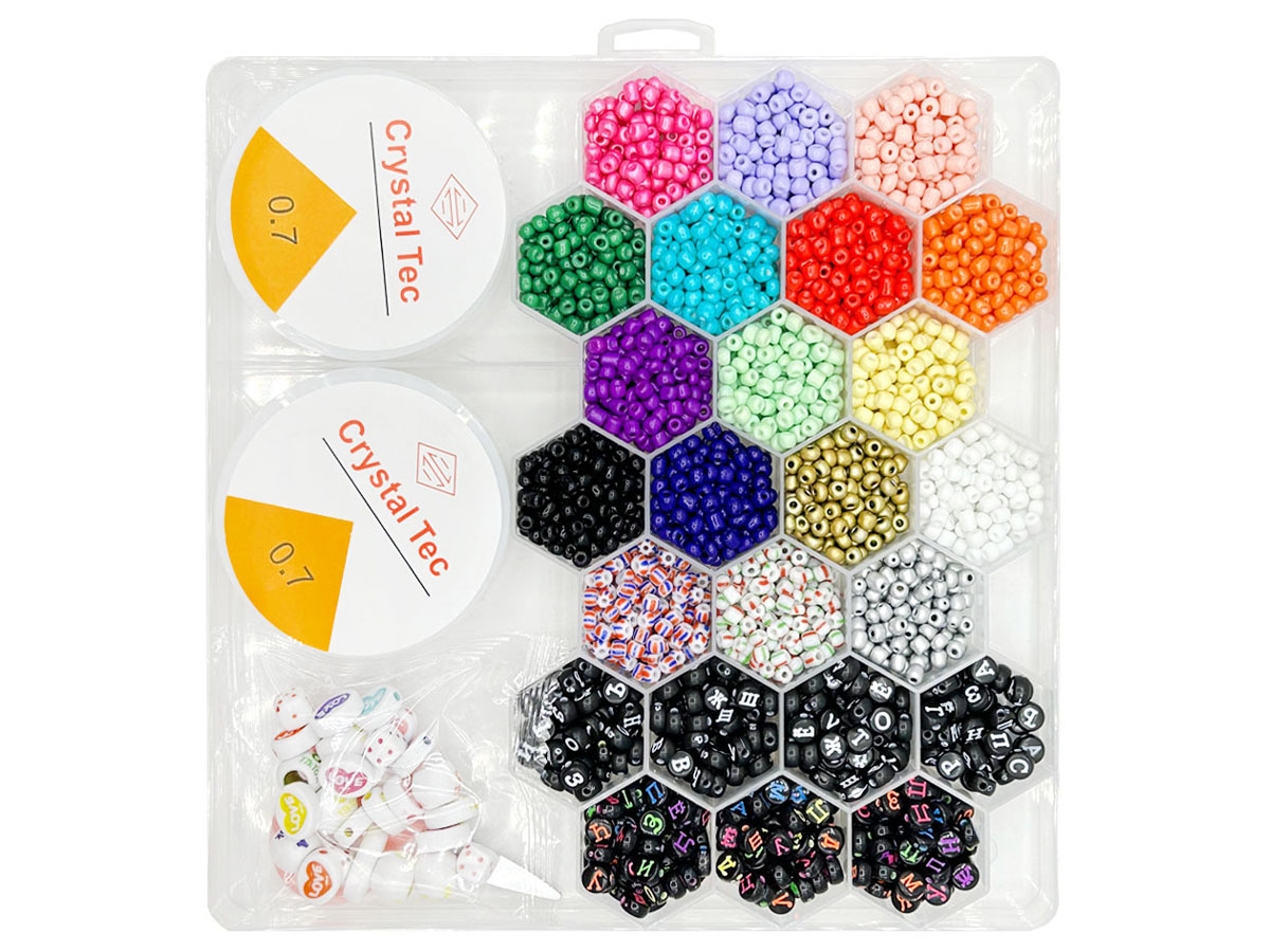 Набор бусин " KWELT " в наборе: пластиковый контейнер, 26 ячеек, фигурные бусины, бисер, буквы, леска, ножницы