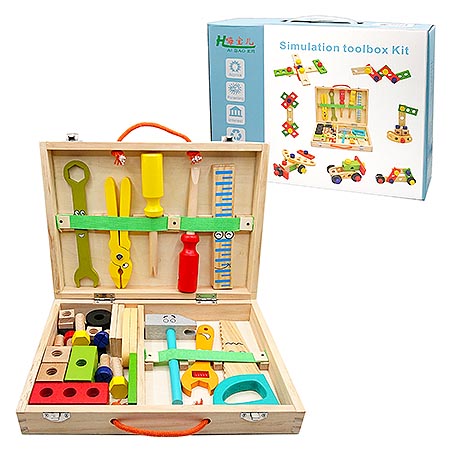 Конструктор " KWELT " ToolBox 34 элемента, дерево, деревянный чемоданчик с веревочными ручками, инструкция, пластиковая ручка, картонная упаковка 22,5*30*6,7см