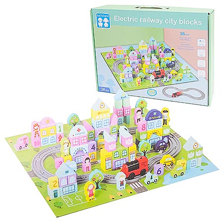 Конструктор " KWELT " Electric railway city blocks 111 деталей, паровозик на 1батарейке АА (в комплекте), дерево/пластик, инструкция по сборке, картонная упаковка с ручкой 38*28*7,5см