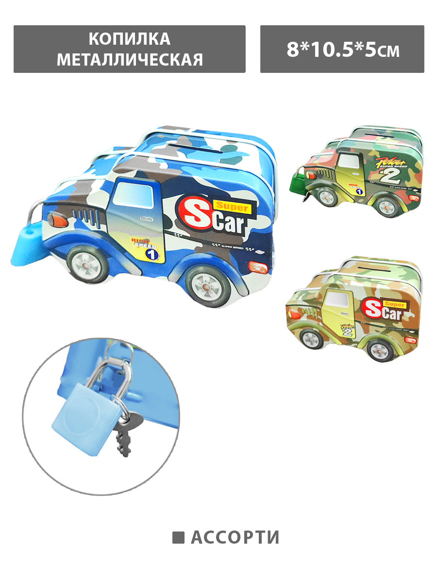 Копилка металлическая " KWELT " Super car, Ассорти (без возможности выбора дизайна), 10,5*6,5*5см, замок, 2 ключа, пакет