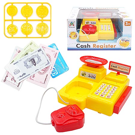 Касса " Cash register " 13*13*8см, в наборе: банкноты, монеты, продукты питания, световые и звуковые эффекты, работает от 2х батареек АА (в комплект не входят), картонная коробка 21*14,5*11,5см