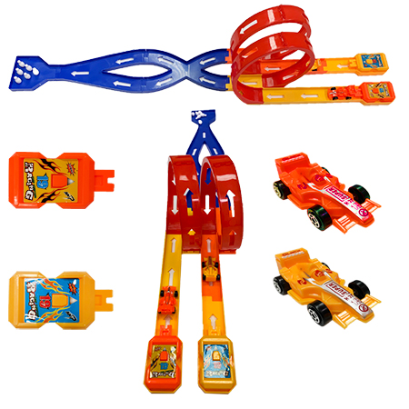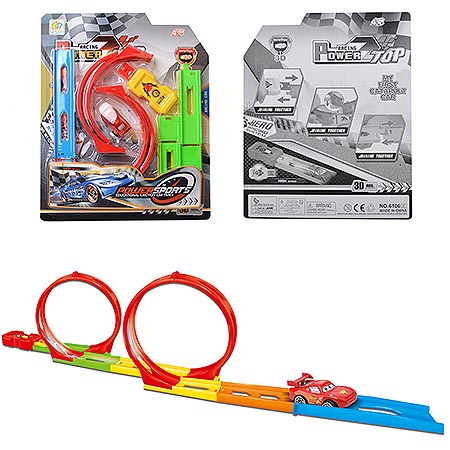 Автотрек " Track racing " в наборе: машина 7*3см, детали трека 13 деталей, наклейки, кольцо- 1шт, картонная упаковка 45*25см