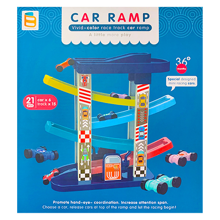 Автотрек " Car Ramp " в наборе: 6 машинок 4,5*3,5см, детали для трассы- 15шт, наклейки, картонная упаковка 29*25,5*7,5см