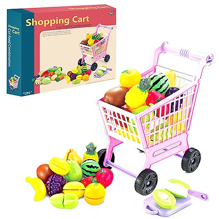 Тележка с продуктами " Shopping Cart " в наборе: тележка 25,5*26см, фрукты - 14шт, нож, доска для резки, картонная упаковка 32,5*39см