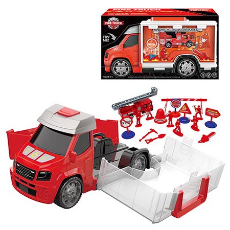 Набор " Fire truck " 17 предметов: пожарная машина световые и звуковые эфекты 32*12*17см, пожарная машина 15*3*6см, пожарный-6шт, топор, лопата, предупредительные знаки-7шт, батарейки в комплекте, картонная коробка 33*13*17,5см
