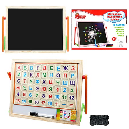 Доска магнитно-маркерная " KWELT " дерево 32*26см с подставкой, в комплекте: маркер со стирателем, буквы, цифры, знаки, мелки 4цв, губка, картонная упаковка