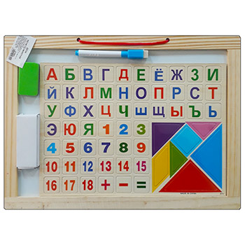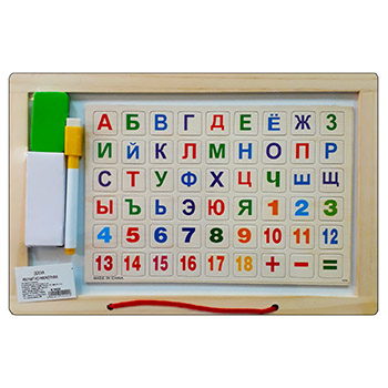 Доска магнитно-маркерная " KWELT " дерево 38*27см в комплекте: маркер со стирателем, буквы, цифры, цветные фигуры, мелки - 3цв, губка, на шнурке