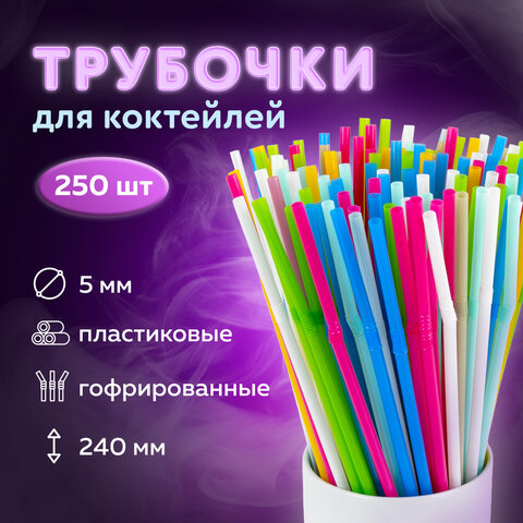 Трубочки для коктейлей гофрированные, пластиковые 5 х 240 мм, цветные КОМПЛЕКТ 250 штук, LAIMA, 608361