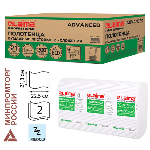 Полотенца бумажные 200 шт., LAIMA (H2) ADVANCED, 2-слойные, белые, КОМПЛЕКТ 21 пачка, 22,5х21,3, Z-сложение, 111337