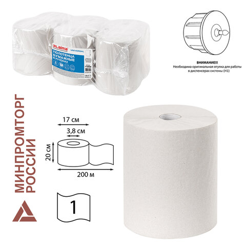 Полотенца бумажные рулонные 200 м, LAIMA (Система H1) ADVANCED, 1-слойные, белые, КОМПЛЕКТ 6 рулонов, 112503