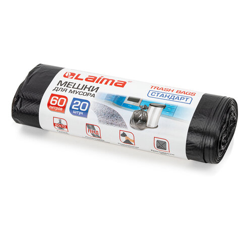 Мешки для мусора 60 л, черные, в рулоне 20 шт., ПНД 10 мкм, 60х70 см, LAIMA стандарт, 601381