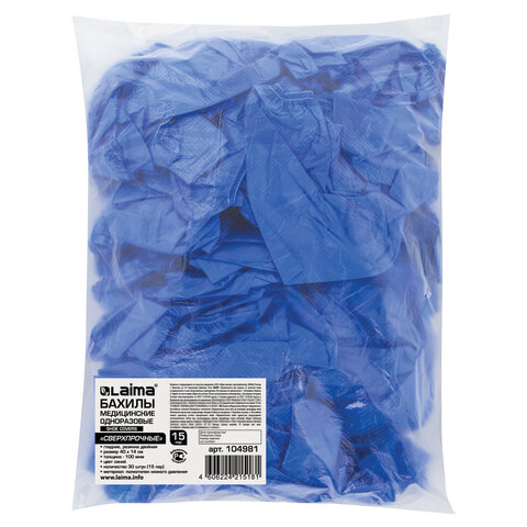 Бахилы КОМПЛЕКТ 30 штук (15 пар), СВЕРХПРОЧНЫЕ, двойная резинка, 40х14 см, 100 мкм, 10 г, LAIMA, 104981