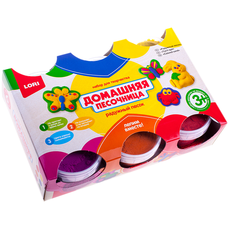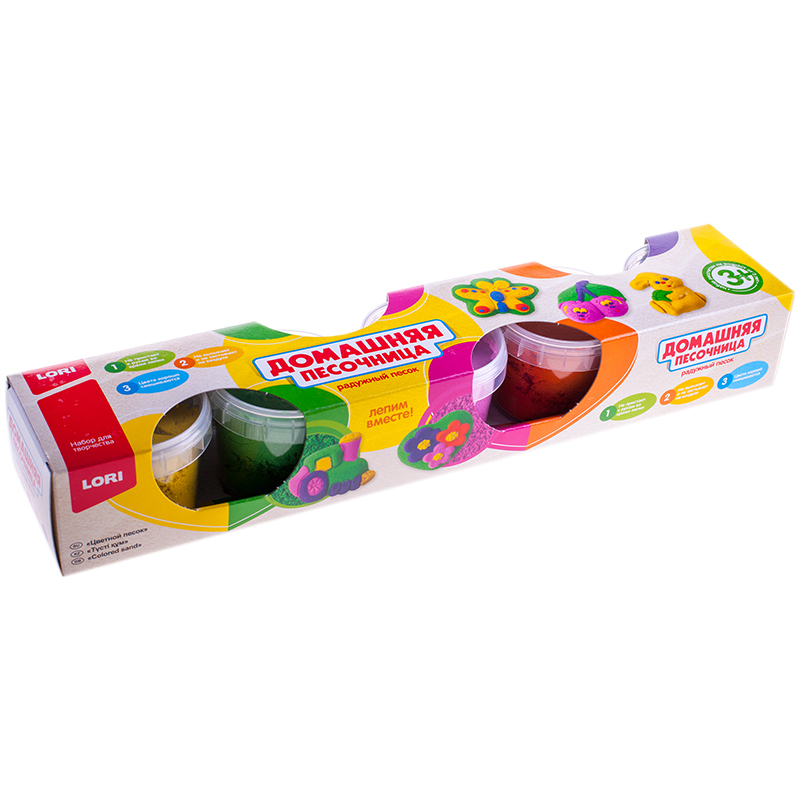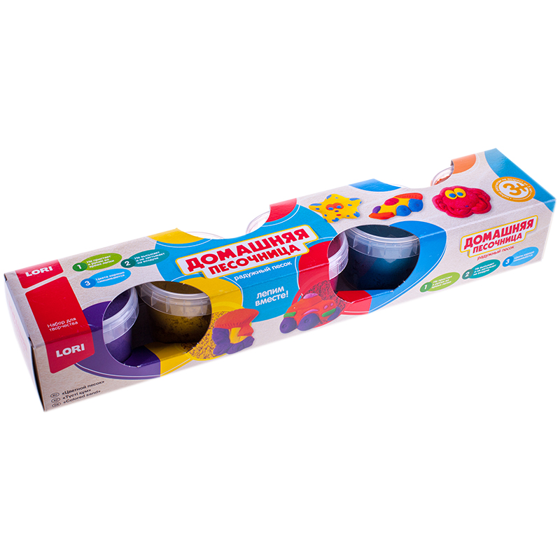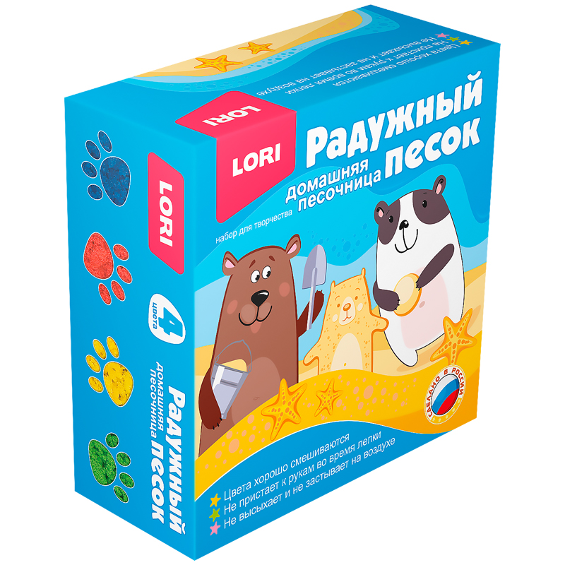 Песок для лепки Lori "Радужный песок", 04 цвета, 560г, в баночке, 2 формочки, картонная упаковка