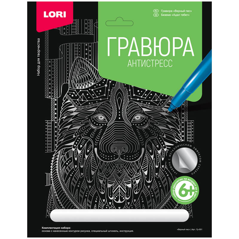 Гравюра с эффектом синий металлик "Хаски", 18х24 см, основа, штихель, LORI, Гр-427