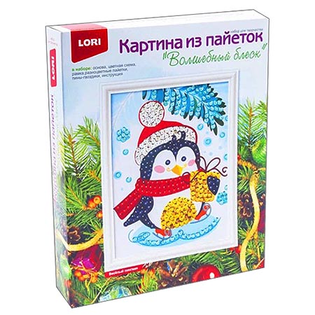 Картина из пайеток " Lori " 20*25см Весёлый пингвин, основа, цветная схема, разноцветные пайетки, пины-гвоздики, инструкция