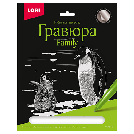 Гравюра " Lori " 18*24см с эффектом серебра Пингвины, основа с контуром рисунка, штихель, инструкция