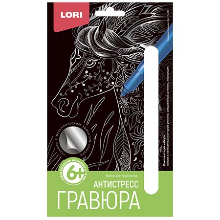 Гравюра-антистресс " Lori " 10*15см с эффектом серебра Красивая лошадь, основа с контуром рисунка, штихель, инструкция