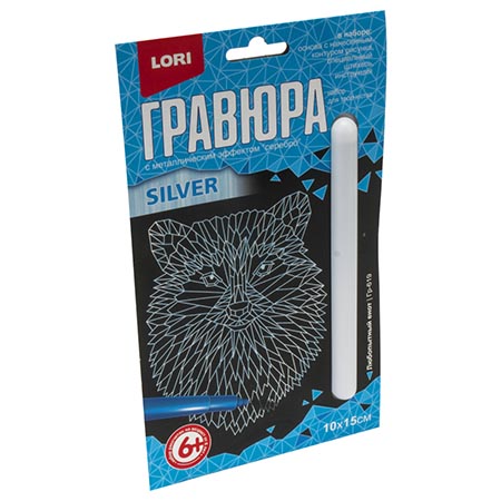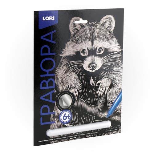 Гравюра " Lori " 18*24см с эффектом серебра Пушистый енот, основа с контуром рисунка, штихель, инструкция