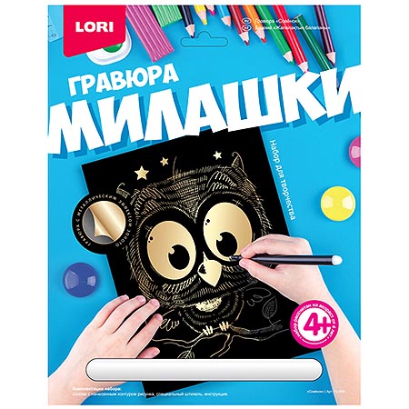 Гравюра " Lori " Милашки 18*24см с эффектом золота Совенок, основа с контуром рисунка, штихель, инструкция