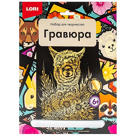 Гравюра " Lori " 18*24см с эффектом золота Обаятельная альпака, основа с контуром рисунка, штихель, инструкция