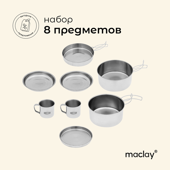Набор посуды Maclay, походный: 2 кружки, 2 миски, сковорода, 2 кастрюли, нержавеющая сталь