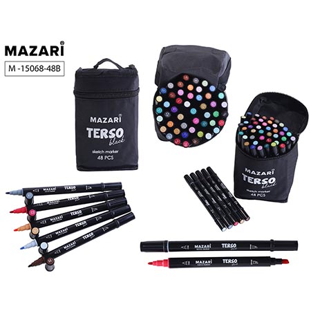 Набор маркеров для скетчинга " Mazari " 48цв Terso black двухсторонние, 1,0-3,0мм, пулевидный/скошенный, круглый корпус, текстильный чехол на молнии