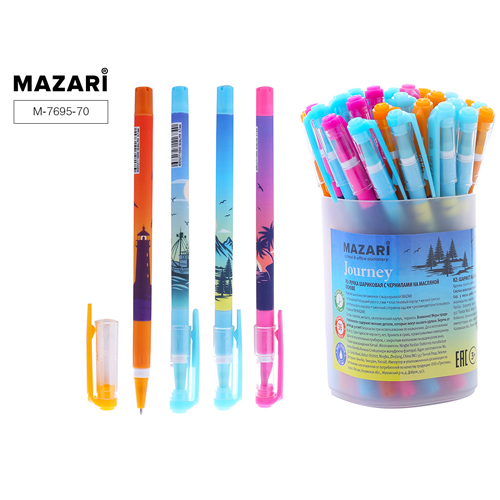 Ручка шариковая " Mazari " Juorney синяя 0,7мм, игольчатый пишуший узел, масляная основа, пластиковый цветной корпус, резиновый грип, 4 дизайна, сменный стержень 144мм, упаковка - туба