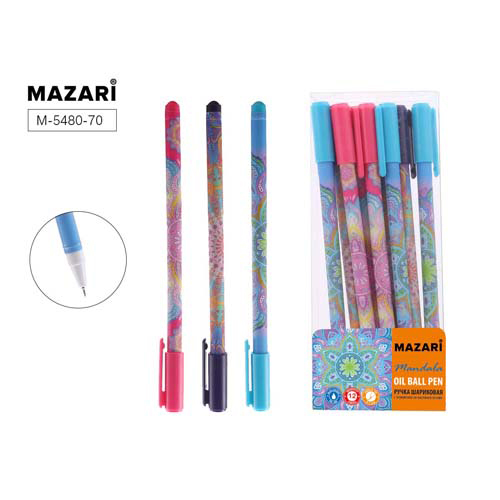 Ручка шариковая " Mazari " Mandala синяя 0,7мм, игольчатый пишуший узел, масляная основа, пластиковый цветной корпус, 4 дизайна, сменный стержень 128мм, упаковка - ПВХ