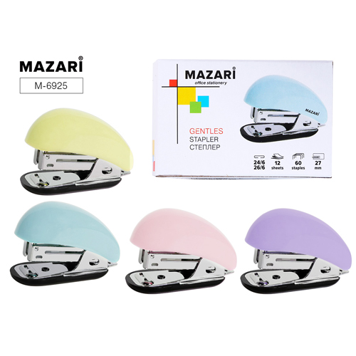 Степлер №10 на 8л " Mazari " Stenx 62скобы, пластиковый, встроенный антистеплер, металлический механизм подачи скоб, ассорти (без возможности выбора цвета), глубина закладки бумаги 27мм, картонная упаковка