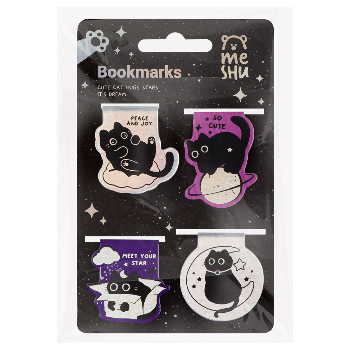 Закладки магнитные для книг, 4шт., MESHU "Meow Space", голографическая фольга