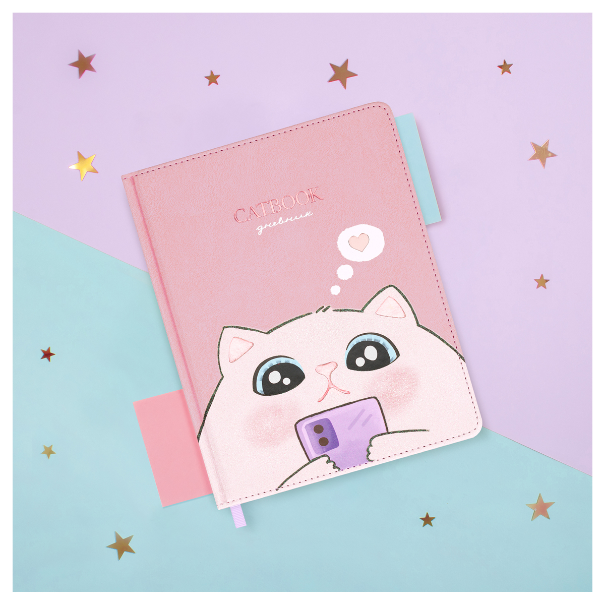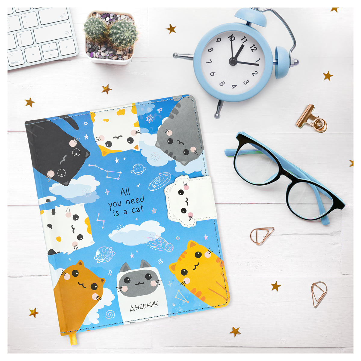 Дневник 1-11 кл. 48л. (твердый) MESHU "Cat Book", иск. кожа, УФ-печать с глиттером, тиснение фольгой, тон. блок, ляссе