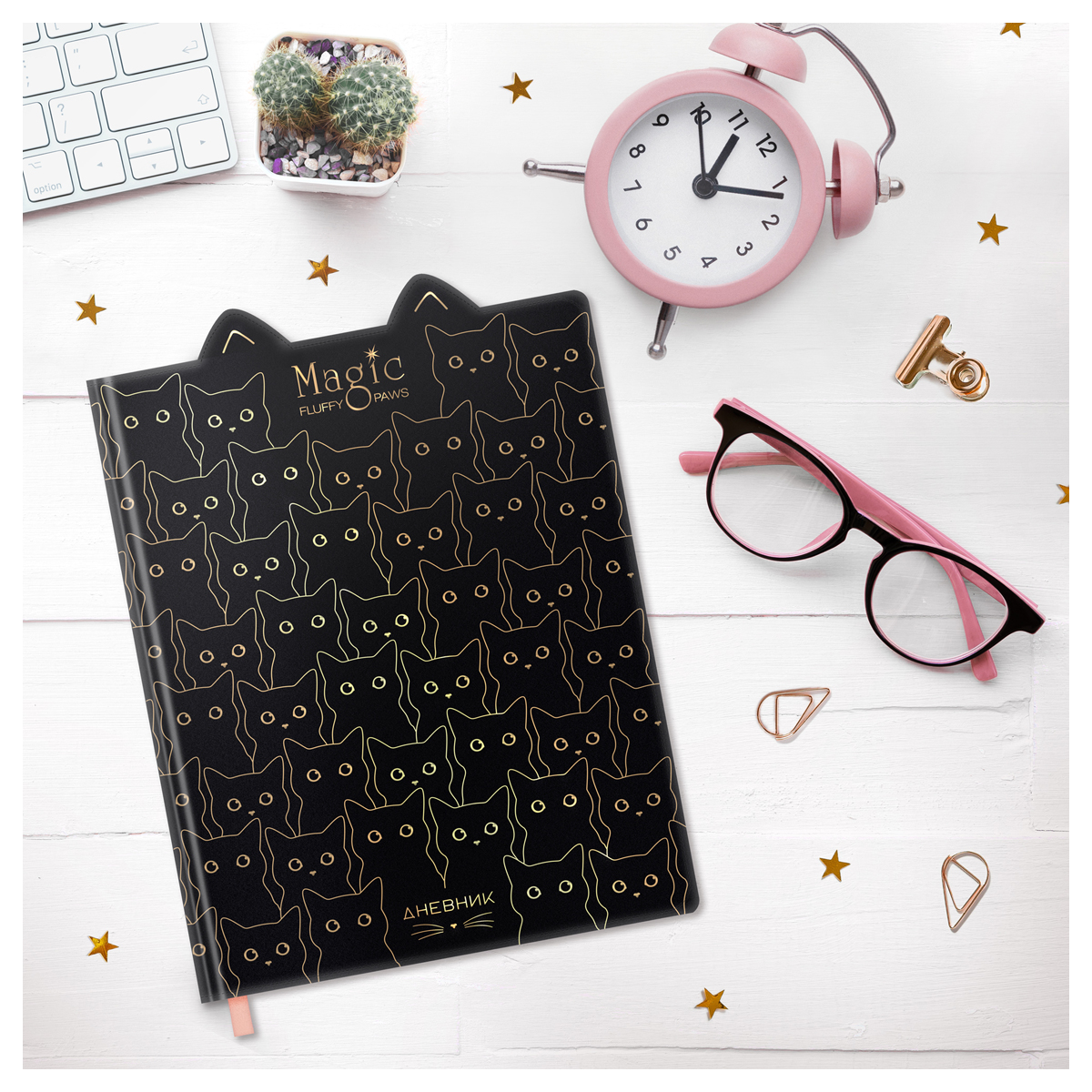 Дневник 1-11 кл. 48л. (твердый) MESHU "Black cat", иск. кожа, фигурная обложка, тиснение фольгой, тон. блок, ляссе