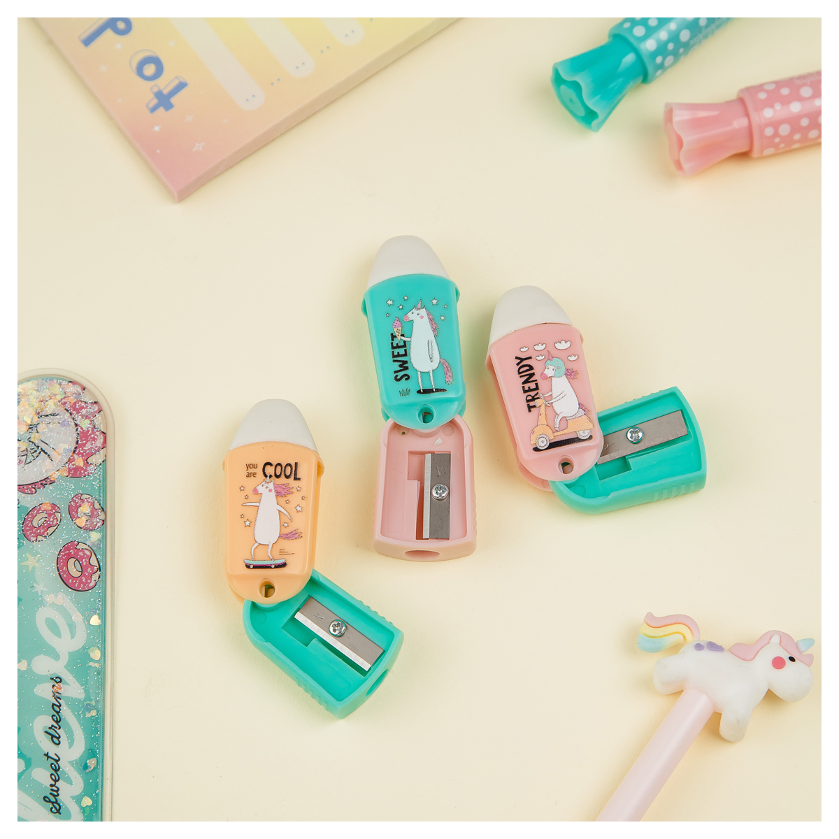 Точилка пластиковая с ластиком MESHU "Unicorn", 1 отверстие, ассорти