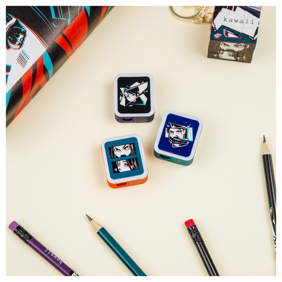 Точилка пластиковая с ластиком MESHU "Anime", 1 отверстие, ассорти