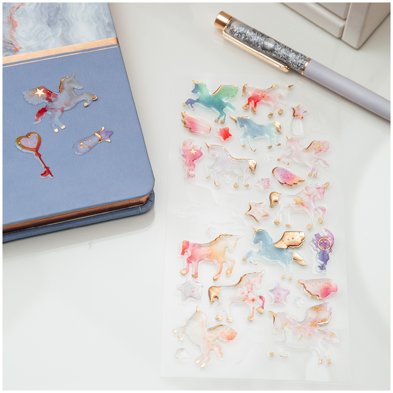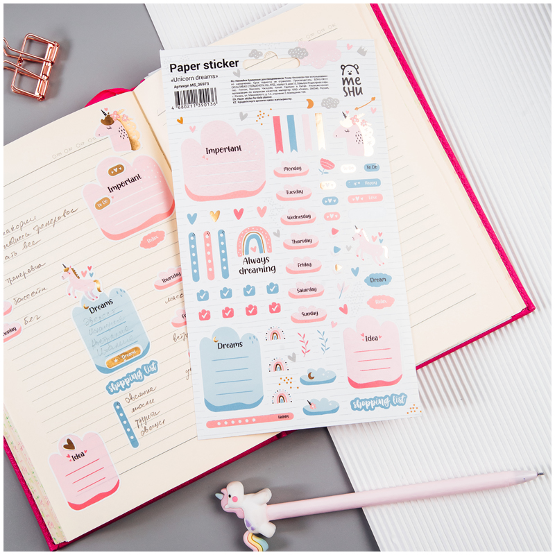 Наклейки бумажные для ежедневников MESHU "Unicorn dreams", 12*21см, фольга, 56 наклеек, европодвес