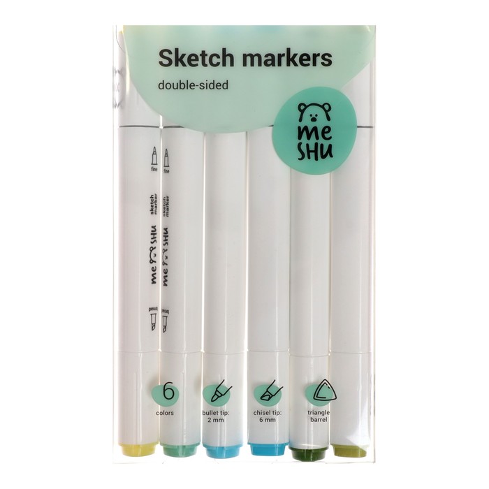 Маркеры для скетчинга двусторонние MESHU, 6 цветов (морские цвета)