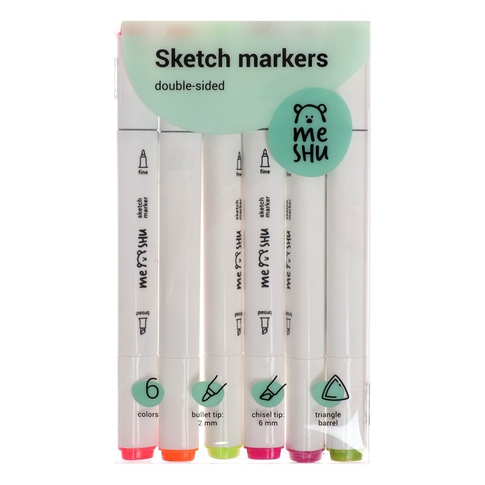 Маркеры для скетчинга двусторонние MESHU, 6 цветов (флуоресцентные цвета)