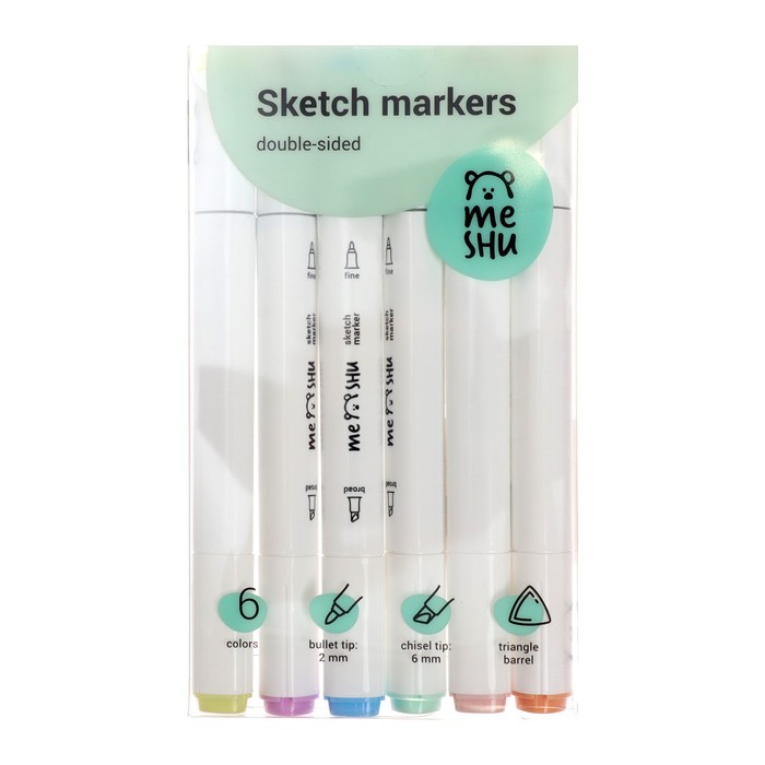 Маркеры для скетчинга двусторонние MESHU, 6 цветов (пастельные цвета)