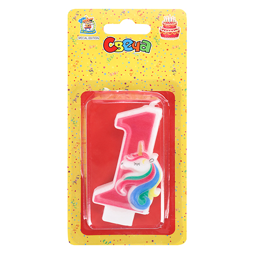 Свеча для торта цифра " Миленд " Милый единорог Розовая Цифра 1 14*6,5*1см, картонный блистер, европодвес