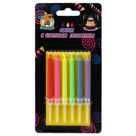 Набор свечей для торта с подставками " Миленд " С цветным пламенем, разноцветные, 6шт, 15,5*7,5*0,5см, картонный блистер, европодвес