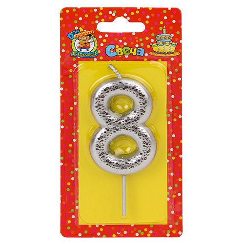 Свеча для торта цифра " Миленд " Серебряная Цифра 8 14*6,5*1см, картонный блистер, европодвес