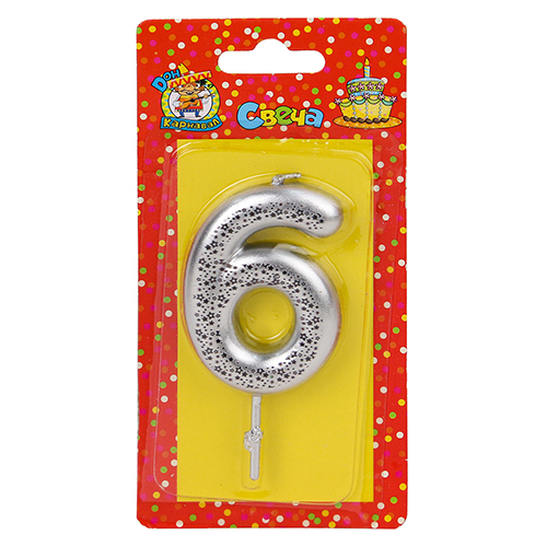 Свеча для торта цифра " Миленд " Серебряная Цифра 6 14*6,5*1см, картонный блистер, европодвес