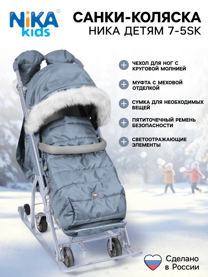 Санки - коляска «Ника Детям 7-5SK», чехол для ног, рукавички, сумка, серый