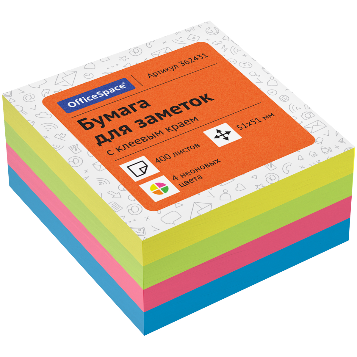 Самоклеящийся блок OfficeSpace, 51*51мм, 400л., 4 неоновых цвета