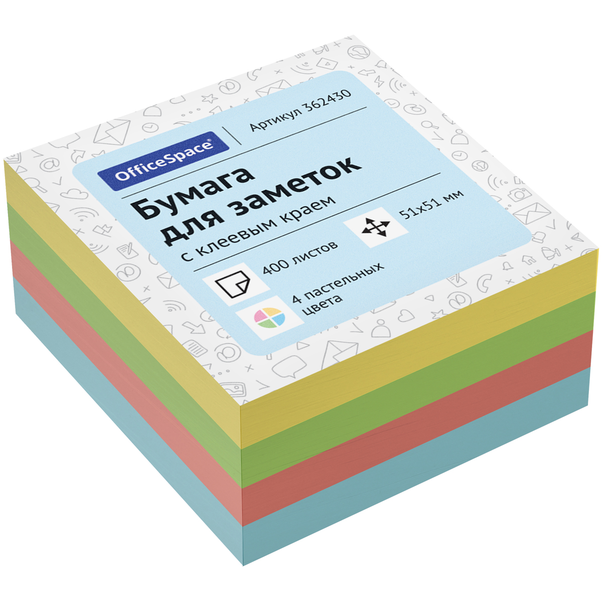 Самоклеящийся блок OfficeSpace, 51*51мм, 400л., 4 пастельных цвета