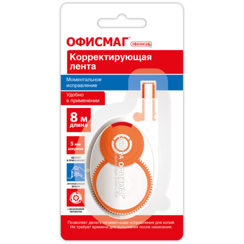 Корректирующая лента ОФИСМАГ, 5 мм х 8 м, корпус оранжевый, блистер, 226812