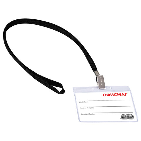 Бейдж горизонтальный (60х90 мм), на черной ленте 45 см, ОФИСМАГ, 235707
