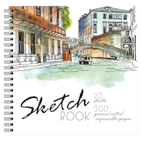 Скетчбук, акварельная белая бумага 300 г/м2, 200х200 мм, 20 л., гребень, SoftTouch, брайль, "Venice", 97262