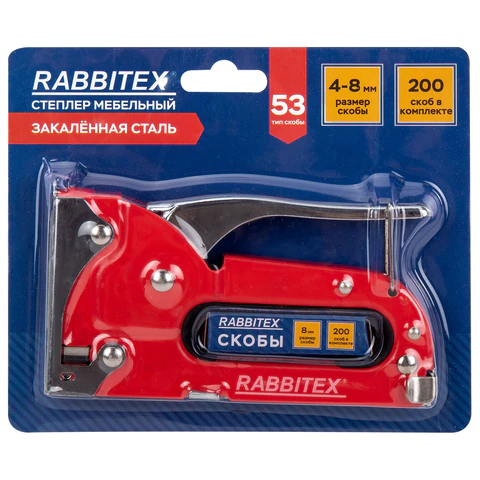 Степлер мебельный стальной, тип скобы 53, высота скоб 4-8 мм, 200 скоб 8 мм в комплекте, RABBITEX (РАББИТЕКС), 671322