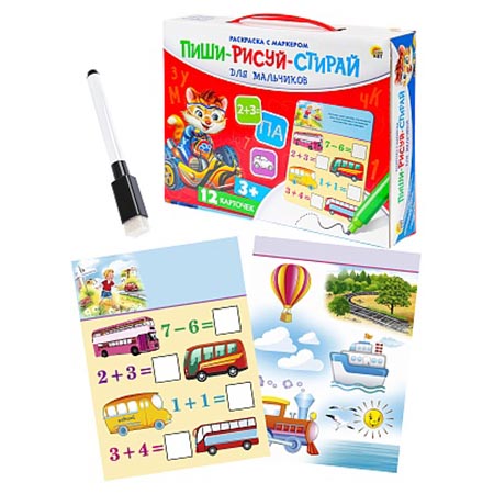 Обучающее пособие " Рыжий кот " Пиши-рисуй- стирай А5 Для мальчиков, в наборе: 12 карточек из ламинированного картона с заданиями 165*220мм, маркер, картонная упаковка